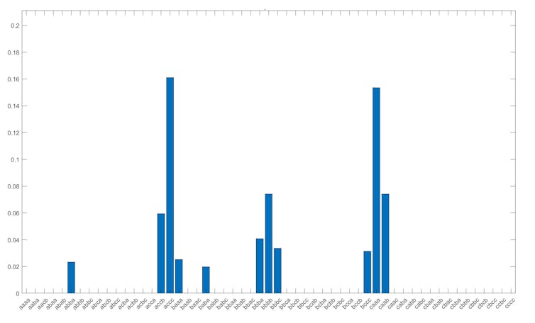 Figures 1 and 2 give an idea of what this approach can yield. To create them, we have assumed that each of the four key variables (economic growth, carbon intensity, energy intensity and population growth, in order) can exist in a “low”, “medium” or “high” state (associated with the first, second, or third tercile of their distributions, respectively, and labelled a, b and c). Figure 1 then shows the 10 most likely scenarios, and Figure 2 displays the average temperature in each of these scenarios (given an emission pathway).