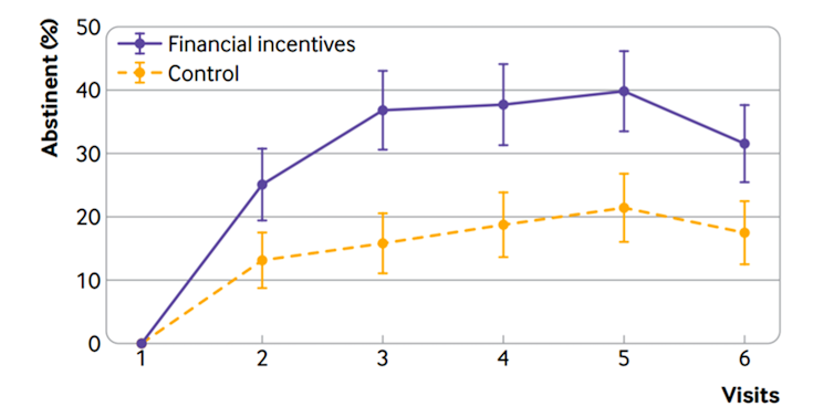 The participants’ smoking abstinence was assessed by self-report of smoking, and by a test measuring carbon monoxide level in the expired air, a standard measure of smoke exposure. At each visit, participants of the financial incentives group received vouchers whose amount depended on their current abstinence, and on their past abstinence. The more times they were abstinent, the larger was the amount of financial rewards. The maximum amount that could be earned in the study was 520 euros. Each 20 € voucher could be redeemed in many shops (including groceries, childcare equipment, etc.) but they could not be used to purchase tobacco or alcohol.