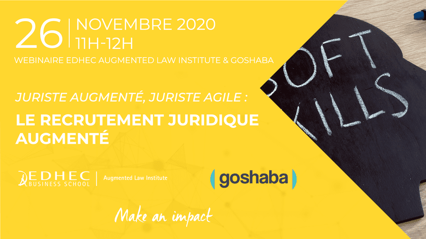 EDHEC Augmented Law Institute et Goshaba, start-up proposant la première solution de recrutement qui révèle les potentiels et mesure les soft-skills d’une manière scientifique vous invitent au webinaire "Juriste augmenté, Juriste agile : le recrutement juridique augmenté" le jeudi 26 novembre 2020 de 11h à 12h.