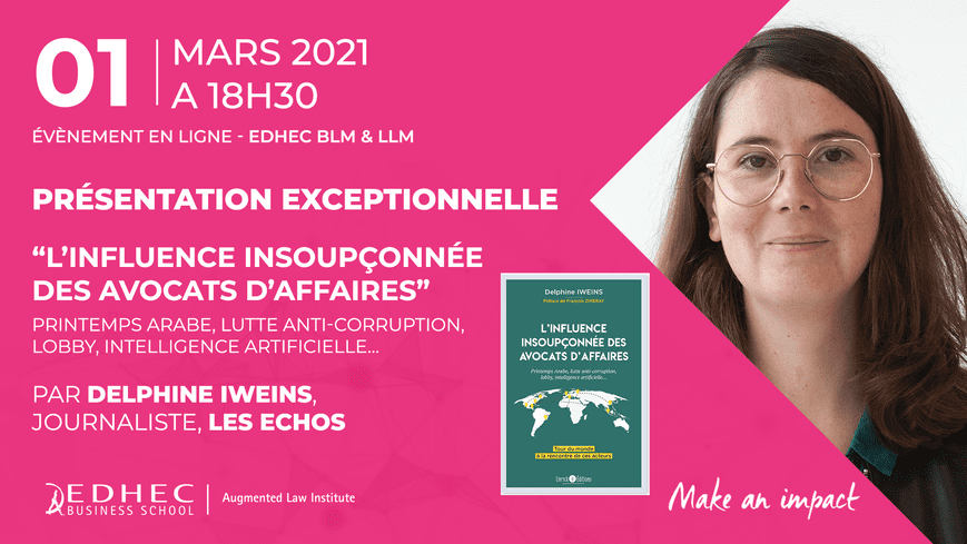 A l'occasion d'un webinar exceptionnel organisé par l'EDHEC Augmented Law Institute, Christophe Roquilly, professeur et Directeur de l'EDHEC ALI accueillera Delphine Iweins, pour une présentation de son dernier ouvrage "L’INFLUENCE INSOUPÇONNÉE DES AVOCATS D’AFFAIRES : Printemps arabe, lutte anti-corruption, lobby, intelligence artificielle…"