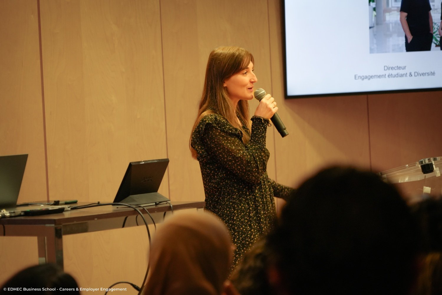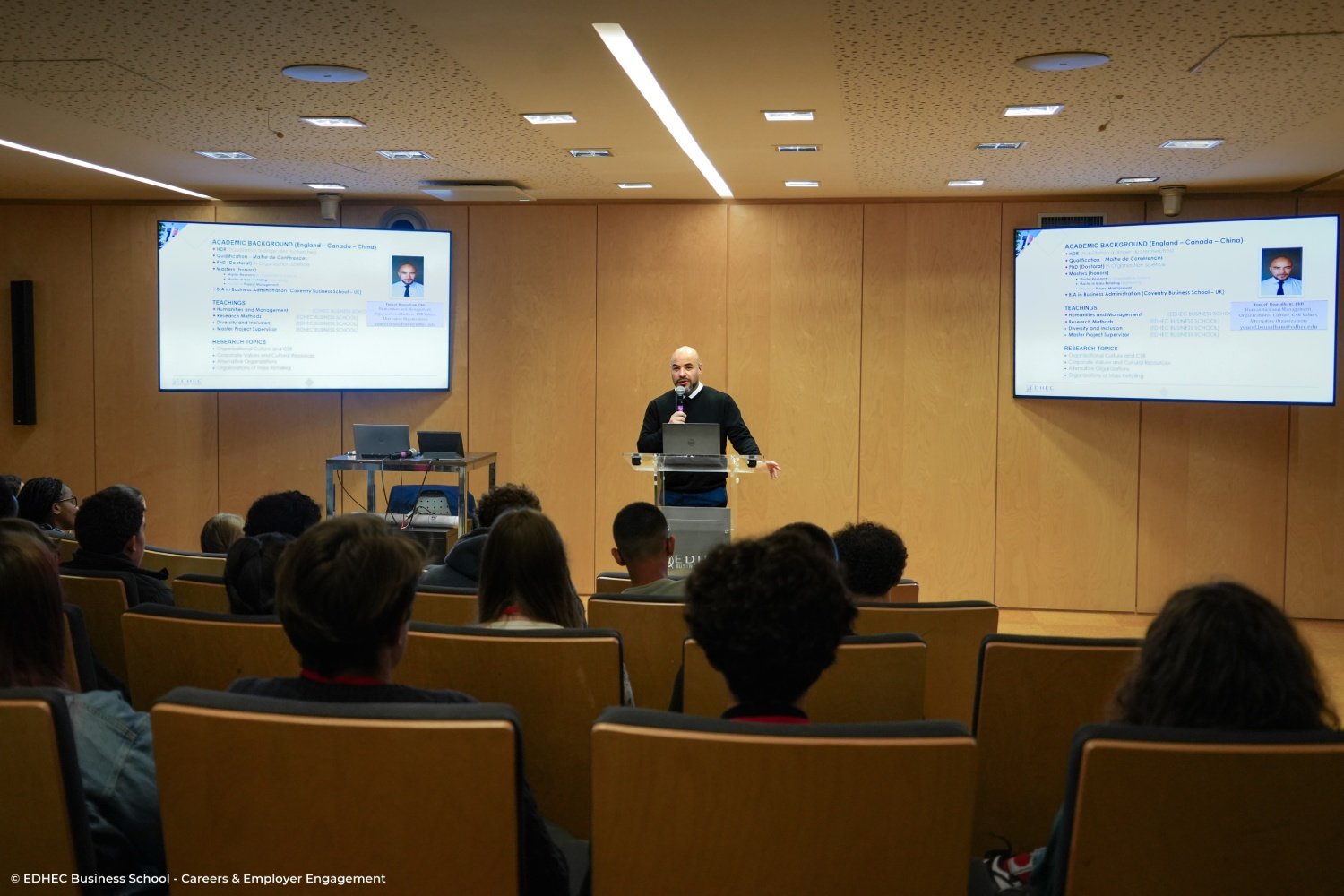 Youcef Bousalham, Associate Professor à l’EDHEC a été le premier intervenant de cette journée. À travers son parcours et sa démarche mêlant sociologie et psychologie, il a invité les lycéens à réfléchir à la manière dont la connaissance de soi peut devenir un levier d’ambition et de réussite. Lors de sa prise de parole, il est revenu sur son parcours académique et sur les spécificités de sa profession à la croisée des humanités et du management : la conduite de travaux de recherche, la publication d’articles et l’enseignement auprès des étudiants de l’école. S’appuyant sur son propre parcours, il a invité les lycéens à réfléchir aux facteurs qui façonnent les trajectoires individuelles, en mobilisant des notions de sociologie telles que l’habitus, le capital culturel et l’indice de position sociale (IPS). « Comprendre d’où l’on vient, c’est aussi se donner les moyens de travailler à ce que l’on veut devenir », précise-t-il.