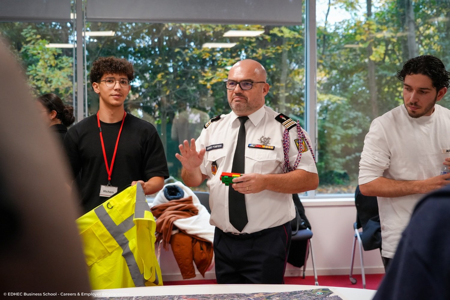 Le lieutenant-colonel Arnaud Gras, sous-directeur territorial des Sapeurs-Pompiers de la Sarthe, a été le second intervenant de la journée. Durant sa prise de parole, il a expliqué les grandes étapes de son parcours et les contours de son métier : l’encadrement de milliers d’agents et la responsabilité que cela implique, la prise de décision dans des moments critiques, mais aussi la solidarité dans le corps des Sapeurs-Pompiers. Par la suite, le lieutenant-colonel est revenu sur sa vision de la gestion d’équipe. Selon lui, un responsable doit être dans une posture d’écoute active, en particulier lors de situations à risque. Il a notamment relaté les actions de ses équipes sur les feux de forêt de 2022 en Gironde. Enfin, durant son intervention, il a répondu aux questions des étudiants en soulignant ce qui fait tout l’intérêt de son métier : servir les citoyens, tout en exerçant une fonction où se mêlent présence sur le terrain et missions en bureau.