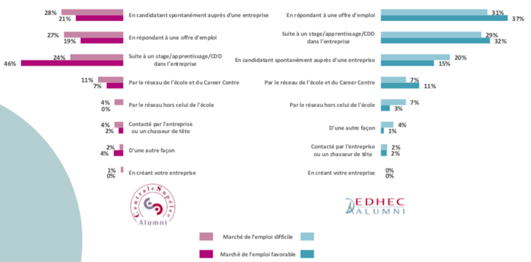 En effet, en période de crise, 29 % des jeunes diplômés ayant répondu à l’enquête ont trouvé leur premier emploi en répondant à une offre. Pour les étudiants de CentraleSupélec, le plus grand pourcentage d’entre eux a obtenu son premier emploi à la suite d’une candidature spontanée.