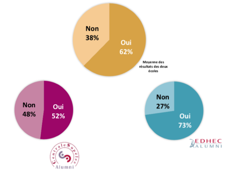 Parmi les diplômés interrogés lors de l’enquête, 62 % considèrent qu’une insertion professionnelle en période de crise économique leur a permis de faire preuve d’agilité et d’adaptation (73 % pour les diplômés de l’EDHEC et 52 % pour les diplômés de CentraleSupélec).