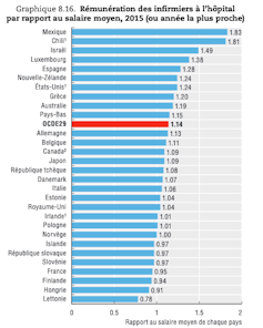 Selon les données de l’OCDE publiées en 2017, le salaire des infirmiers des hôpitaux publics serait par exemple particulièrement bas, en moyenne 5 % en deçà du salaire moyen national, classant la France parmi les 5 derniers pays sur les 29 pays développés considérés.
