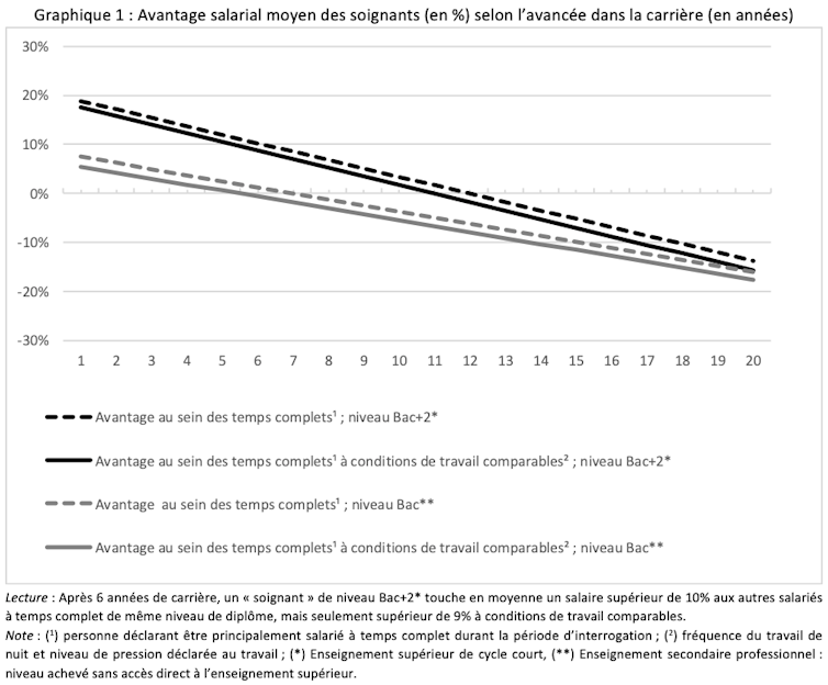Cependant, selon nos estimations, ce bonus disparaît rapidement au fil de la carrière, se transformant même en un malus conséquent. Pour les infirmiers, le bonus a disparu au bout de 12 ans ; et au bout de 20 ans de carrière, on estime que ces soignants ont un salaire inférieur de 16 % aux autres salariés à temps plein, toutes choses égales par ailleurs.