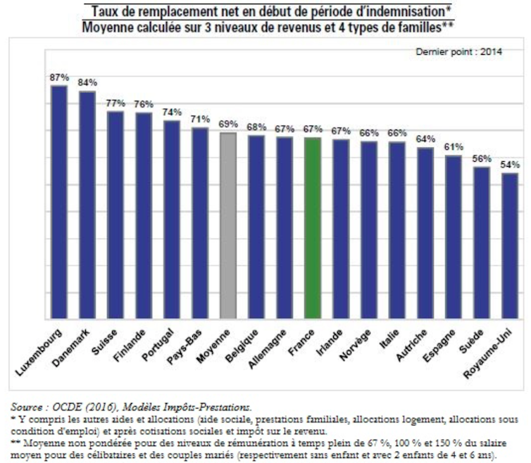 Selon les chiffres les plus récents fournis par la direction générale du Trésor (données OCDE 2016), la France se situe au niveau de la moyenne européenne, avec un ratio de remplacement moyen qui équivaut 67 % en début de période d’indemnisation. Ce chiffre est proche de celui calculé pour l’Allemagne, supérieur aux 54 % obtenus pour le Royaume-Uni, et trois fois plus élevé qu’aux États-Unis. Ce ratio moyen « dans la moyenne » masque toutefois une importante hétérogénéité sous-jacente, notamment celle relative à la situation familiale et au précédent niveau de revenu.